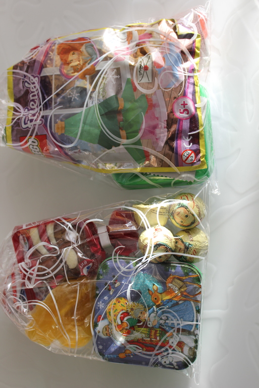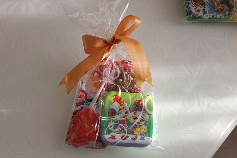 Я такие же подарки сделала для своих детей в группу, только у нас еще добавлены конфеты Аленка и наборчик Лего.