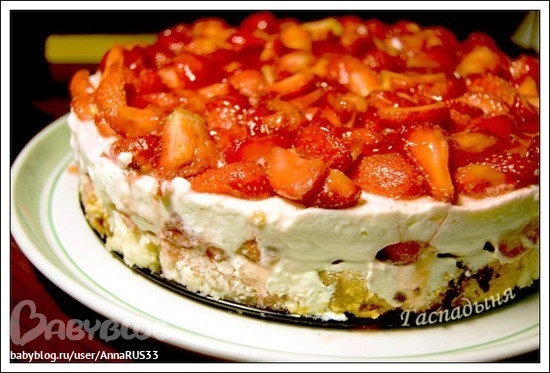 Торт будет трехслойный, каждый слой начинаем с печенья, из которого формируем «коржи», для каждого коржа берем 9 шт. печенья (оставшиеся 3 шт. - для оформления боковин торта). Бананы нарезать маленькими кусочками (до 0,5 см). Сметану смешиваем с творожной массой, добавляем сахар и ароматизатор, взбиваем все миксером до густой, однородной, воздушной массы. Молоко выливаем в миску и, обмакивая в нем каждое печенье, раскладываем его на пергаментную бумагу, формируя первый корж (квадрат 3x3 печенья). Поверх печенья аккуратно распределяем тонким слоем (не забывая, что у нас 3 слоя в торте) измельченный банан. Затем сверху заливаем одной третью сметанно-творожного крема, и так до верхнего слоя. Теперь измельчите оставшееся печенье и, поправив края, если есть потеки крема, аккуратно посыпьте боковины торта. Сверху украсить клубникой. Готовый торт уберите на холод для пропитки на ночь.
