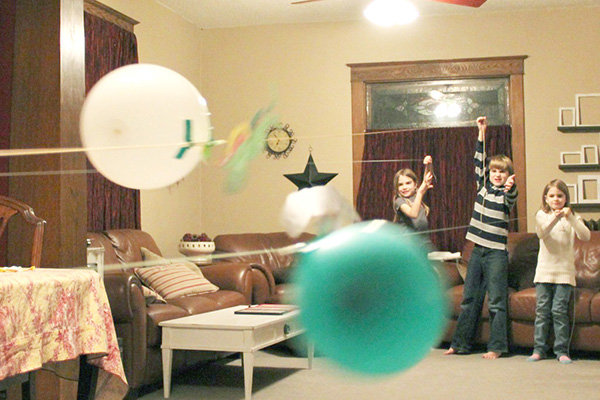 Также по ниткам можно пускать воздушные шарики, к которым скотчем приклеена трубочка, в которую эта нитку вдета. Шарик не завязывается, и по мере того, как воздух будет выходить, шарик будет двигаться по нитке вперёд!)