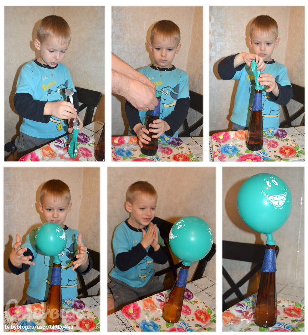 Ход эксперимента: в шарик насыпаем соду, примерно 3-4 ч.л, бутылку на 1/4 наполняем уксусом 9%, натягиваем шарик на горлышко бутылки, ссыпаем соду в бутылку и вуа-ля... газ выделяется - шарик надувается.