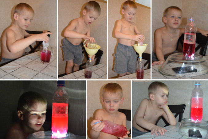 Воду подкрасили пищевым красителем, вылили в бутылку. Следом в бутылку налили масло "Jonson's Baby"(давно стояло без дела). Под стеклянное блюдо положила телефон с включенным фонарем. Бутылку на блюду поставили. Опустили в бутылку 3 таблетки АЦЦ, выключили свет....и вот она...лампа... пузырьки красные стали подниматься вверх, и от света, проникающего сквозь жидкость, все это еще интересней. Потом встряхнули бутылку, и убедились,что вода с маслом не смешивается.