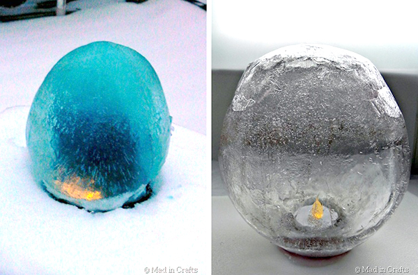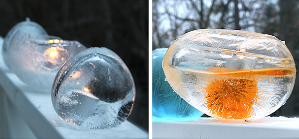 Ещё один вариант - заморозить воду в воздушном шарике. Вода замерзнет только снаружи, а внутри нет. И , если её слить, то получится ледяной плафон, полый внутри!