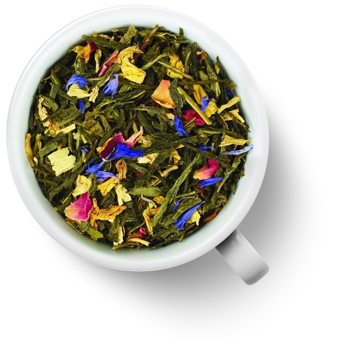 Китайский чай сенча с добавлением лепестков розы, василька и подсолнечника. Чай ароматизирован натуральными маслами.