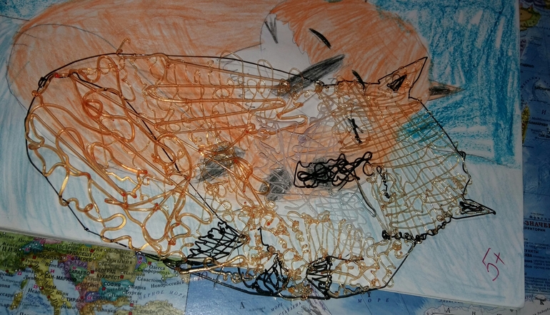 Вот такая лиса-кот у него вышла. Первый блин конечно - комом, но... Мы разглядели в этом комочке произведение искусства и полюбуйтесь, как этот ком отлично смотрится, на фото ниже.