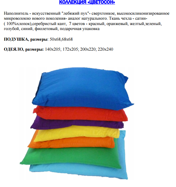 Наполнитель - пух, категории "ЭКСТРА" (отборный серый пух элитных пород гусей). Ткань чехла - тик-жаккард - 100% египетский хлопок (пр-во Чехия). С обработкой многофункциональным гигиеническим и противоаллергенным средством "AСTIGARD". 7 цветов: расный,синий,зеленый,желтый,оранжевый,фиолетовый,голубой,серебристый кант, подарочная упаковка