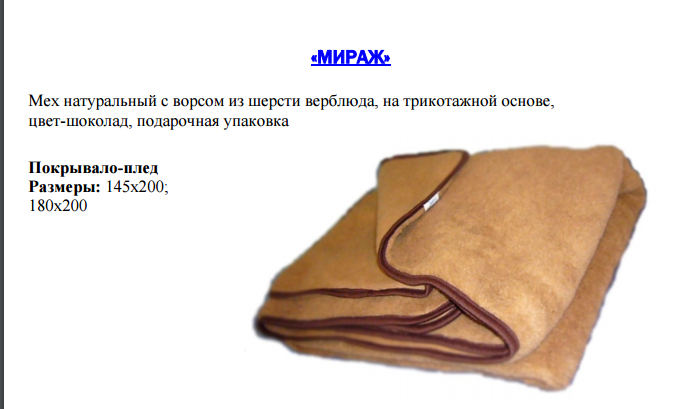 ИЗДЕЛИЯ ИЗ НАТУРАЛЬНОЙ ШЕРСТИ ВЕРБЛЮДА На протяжении ряда лет компания «Славянский пух» выпускает одеяла с наполнителем из верблюжьей шерсти. Изделия, сочетающие в себе стильный и модный дизайн, удачно совмещѐнный с потрясающими потребительскими свойствами, качеством и практичностью. Под таким одеялом не жарко летом и не холодно зимой. Верблюжья шерсть прочнее овечьей. Верблюжья шерсть удерживает воздух, устойчива к загрязнению, очень эластична и практична в использовании. Она не электризуется и лучше других снимает статическое напряжение, имеет способность отталкивать пыль, и даже защищает человека от электромагнитных полей, что имеет большое значение при современном использовании электрических бытовых приборов и компьютерной техники.