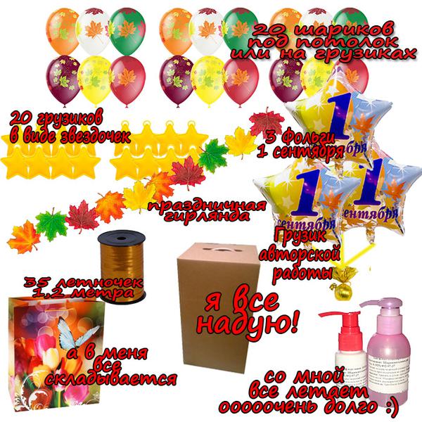 Украсить зал на первое сентября очень просто. Купив готовый комплект для оформления последнего звонка с портативным баллоном с гелием вы легко сделаете это за 1-1.5 часа. В комплект входит абсолютно все необходимое для того что бы украсить первое сентября, а именно тематические шарики, уже нарезанные ленточки, гирлянды, фольгированные шары, Хай-флоат - специальный состав для обработки шаров, грузики и другое.