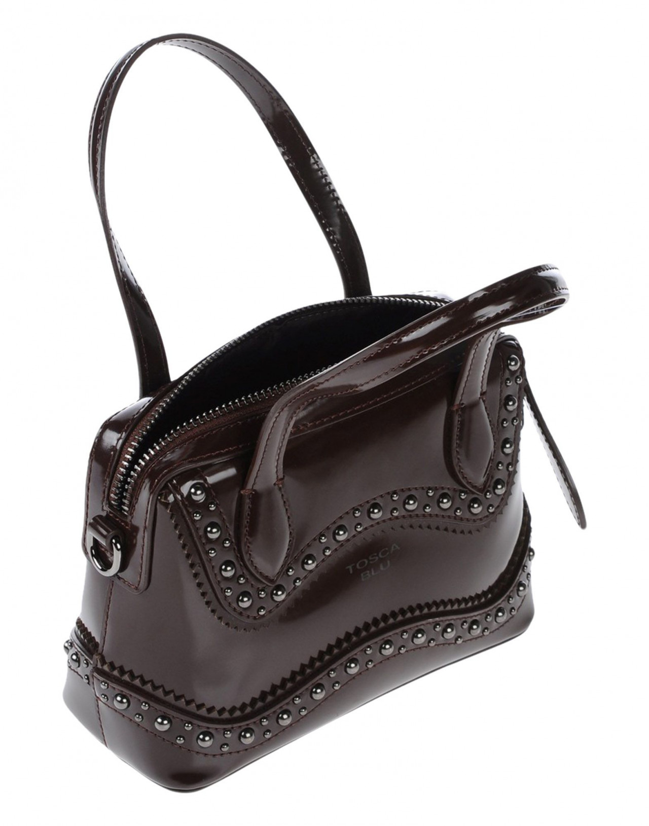 100% ПВХ (Поливинилхлорид),маленький размер, искусственная кожа, эффект лакировки, одноцветное изделие, логотип, аппликации из металла, молния, двойная ручка, внутренние карманы, съемный плечевой ремень, дно с ножками-заклёпками, сумка-саквояж.Размеры: Глубина 8 cm , Высота 14 cm , Длина ручки 37 cm , Ширина 20 cm