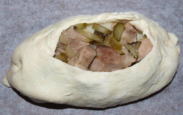 Лодочки из слоеного теста с картофелем, мясом и огурчиками