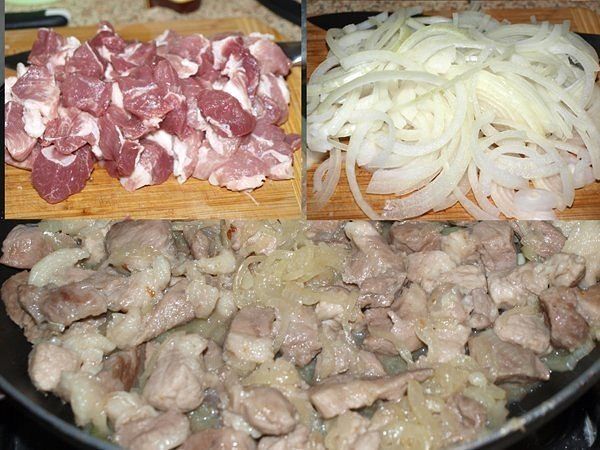 2. мясо порезать кусочками(у меня свинина, лопаточная часть, не постная.)лук режем полукольцами и обжариваем все следующим образом... мясо на сильном огне, помешивая 3 минуты, затем закладываем лук, перемешиваем, убавляем газ и тушим под крышкой еще 10 минут... после открываем крышку и на среднем огне слегка выпариваем сок еще 4 мин. выключаем!