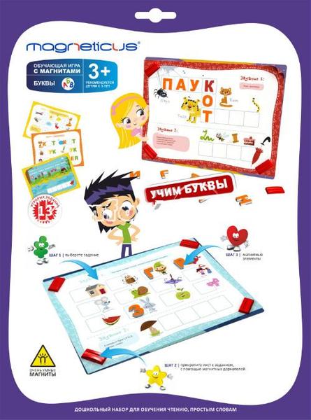 - это креативная обучающая игра, в процессе которой ребенок будет изучать буквы русского алфавита. В набор входят: планшет, куда крепятся листы с заданиями, магнитные держатели и магнитные элементы с буквами. Российская компания Magneticus разрабатывает замечательные тематические наборы, которые прекрасно влияют на развитие детей. Например, тематический набор "Буквы" развивает логическое мышление, креативность и фантазию ребенка. В производстве игрового набора использованы экологически чистые материалы, безопасные для здоровья.