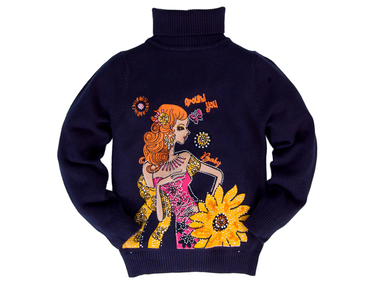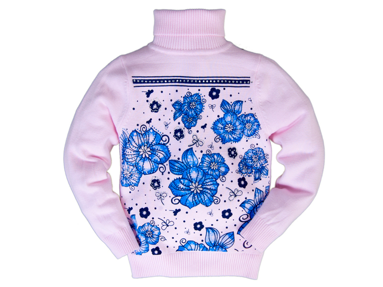 Украшена милыми сердечками в нежно-розовых оттенках и стразами. Водолазка смотрится очень нарядно.