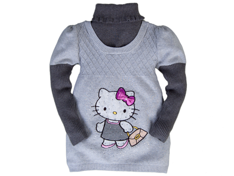 Тепленькое, вязаное платье для самой модной девочки. Высоко закрытое горло является незаменимой вещью в холодную погоду. Платье украшено милой кошечкой Китти, усыпанной стразами. Дополнительным декором является объемный бантик на ушке у кошечки. Сочетание светло-серого и темно-серого цветов делают эту модель по-взрослому модной.