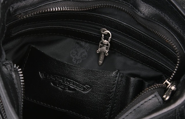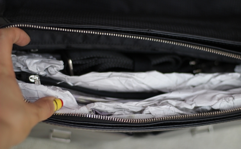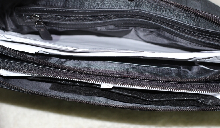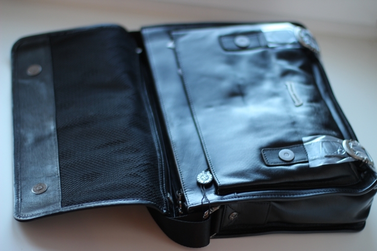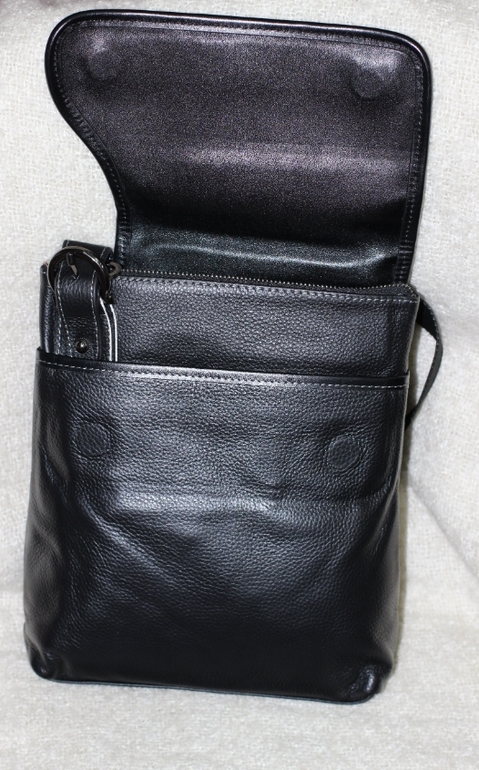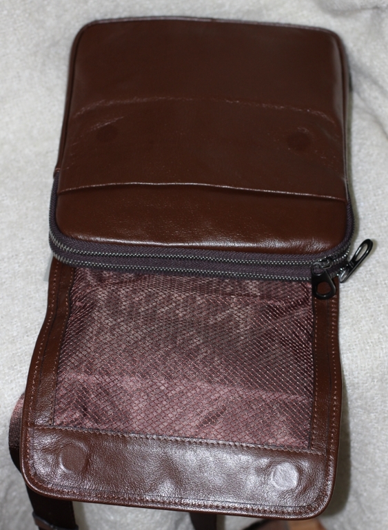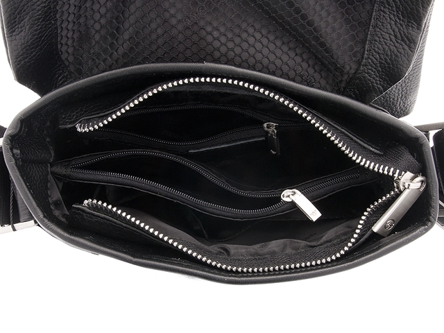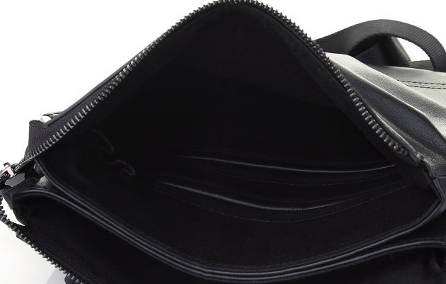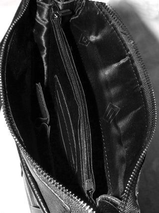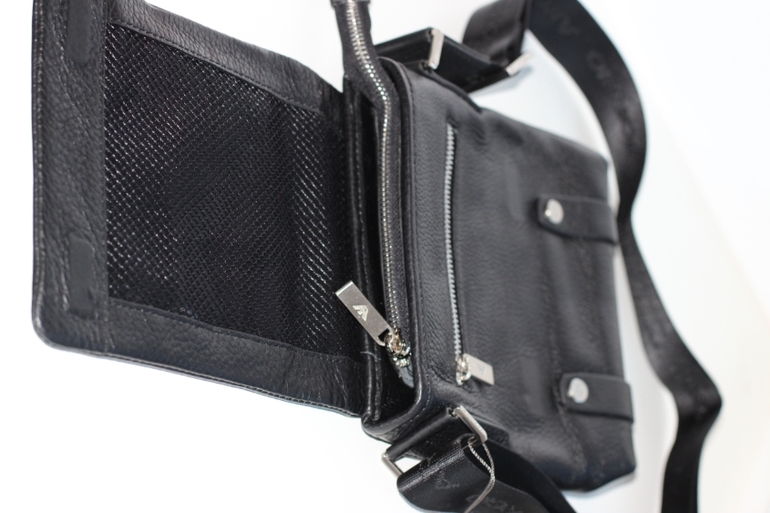 Внутри 1 отделение, карман на молнии и 2 кармана под моб. тел. Снаружи, спереди под клапаном и сзади по карману.