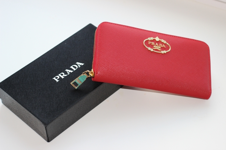 1. Женский кошелёк Prada на кнопке украшен фирменным логотипом