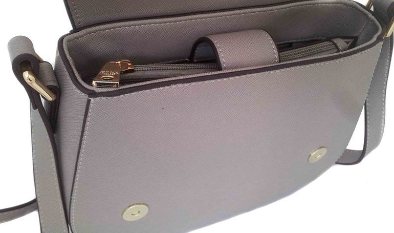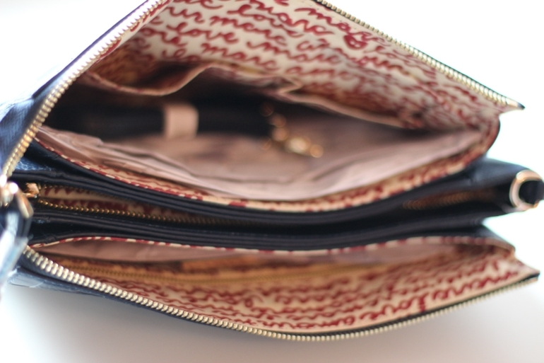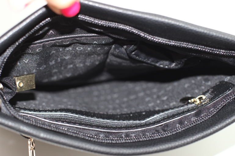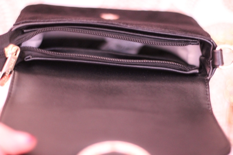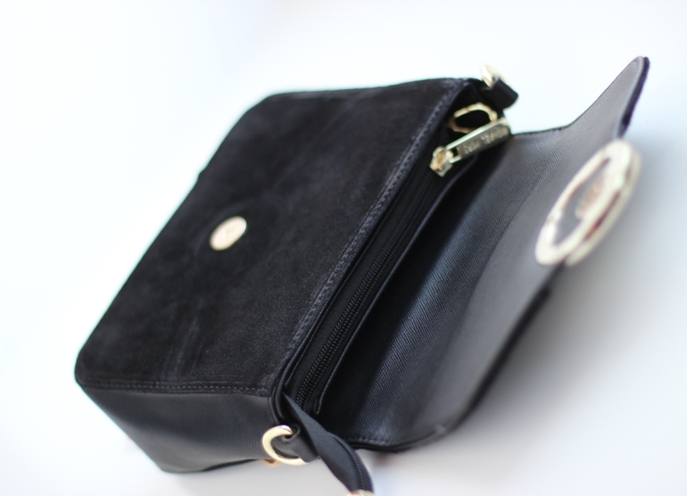 Одно основное отделение. Дополнительный кармашек на молнии. Зеркальце.