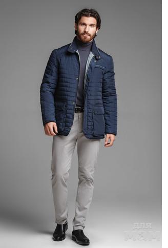 Куртка мужская, удлиненная до середины бедра, силуэт "slimfit". Верх куртки стеганный. Центральная застёжка на металлической молнии с фирменным слайдером IGOR PLAXA. Ветрозащитная планка на металлических кнопках темно-синего цвета. Воротник стойка на двух кнопках, по краю окантован тканью серого цвета. Верхняя часть передних полочек и спинки из отделочной ткани серого цвета. На левой полочке врезной карман с листочкой, край окантован отделочной тканью, застегивается на молнии "трактор" с металлическим слайдером. Нижние карманы объемные, накладные, в рамку с клапаном на двух кнопках. На этих карманах расположены дополнительные вертикальные прорезные карманы с небольшим наклоном на застежке молнии. На поясе куртки паты на кнопках для регулирования полноты. Низ куртки пиджачного типа - с закруглением углов. Рукава прямые. На левом рукаве металлический шеврон. Внутри куртки подкладка в клетку. Внутренние нагрудные карманы прорезные, в рамку, застегиваются на молнии. У центральной застежки подкладка из отделочной ткани.