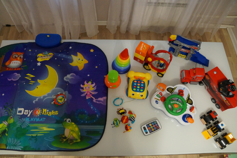 1. Очень классный музыкальный коврик. С одно стороны день, с другой ночь. При нажатии на фигурку издается звук. Игрушка суперская. После моих двоих детей. На заломах немного потерта поверхность (в 2 местах, на фото видно. на работу не влияет) 700 руб