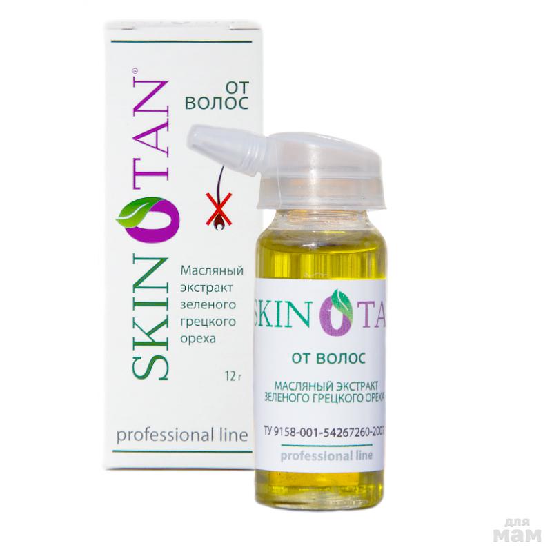 При постоянном применении масляного экстракта зеленого грецкого ореха «Skinotan от волос» происходит поэтапная блокировка роста новых волос и их корни постепенно разрушаются. Что касается результатов, то «Skinotan от волос» действует значительно быстрее и эффективнее любого имеющегося сегодня на рынке средства и при правильном ежедневном применении избавит Вас от нежелательных волос навсегда! «Skinotan от волос» можно применять на любых участках кожи!