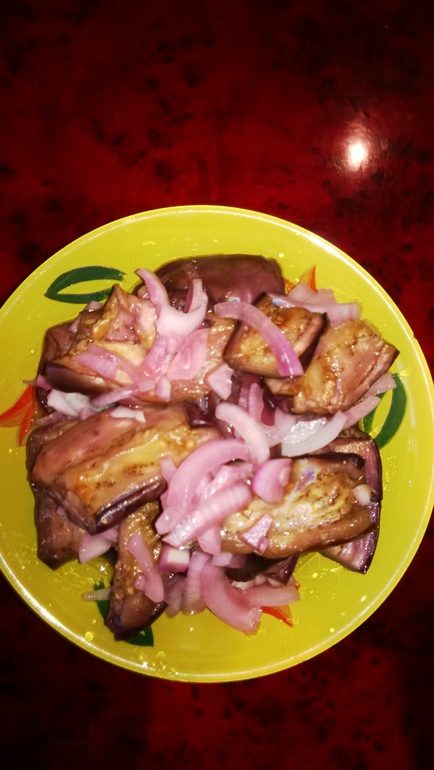 Баклажанчики наши сливаем и выкладываем на бумажное полотенечко,чтоб водичка стекла(это из собственного опыта,а то когда жаришь мокрые-сильно брызгают)Затем на сковородочке их обжариваем и слаживаем в кастрюльку небольшую-слой баклажанчиков,слой лучка,присыпаем чесночком,затем опять слой поджаренных баклажанчиков,слой лучка и чесночком присыпаем.
