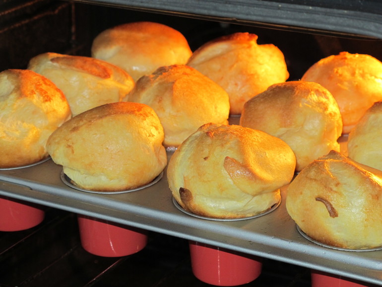 Вот только что я взбила два яйца, стакан муки, стакан молока, соль, сахар. И всёёёёё....даже никакого разрыхлителя тут не надо. Секрет в маленьких формочках и правильной температуре.