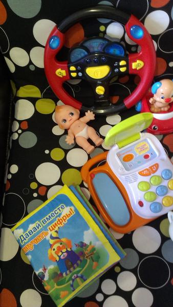 Все в отличном состояние. Желательно пакетом, но можно и по отдельности. Руль 300 руб, телефон с трубкой 500 руб, раскладной телефон фишер прайс 300 руб, машинка с собачкой фишер прайс 600 руб, молоток фишер прайс 500 руб, прорезователь котик 300 руб, мягкая книжечка с пищалкой 200 руб, пупсы по 30 руб, жираф 150, юла 150 руб, игрушки для купания 3 шт 50 руб. Либо за все 2500 руб.