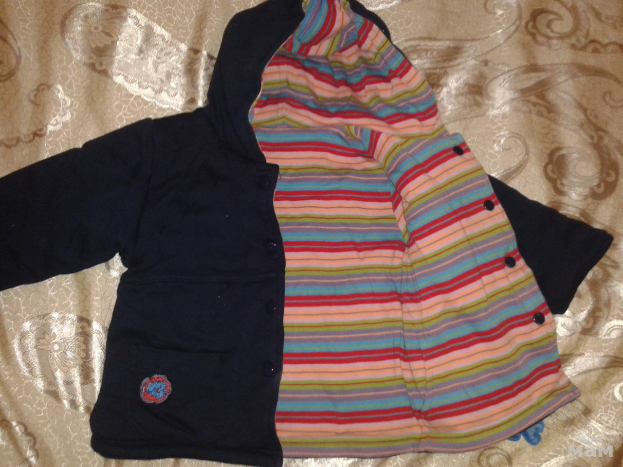 Куртка двухсторонняя, к нему идет сарафан и платье, в зависимости какой стороной носите. Размер 74. Покупали в Германии. Цена комплекта 2500 руб.
