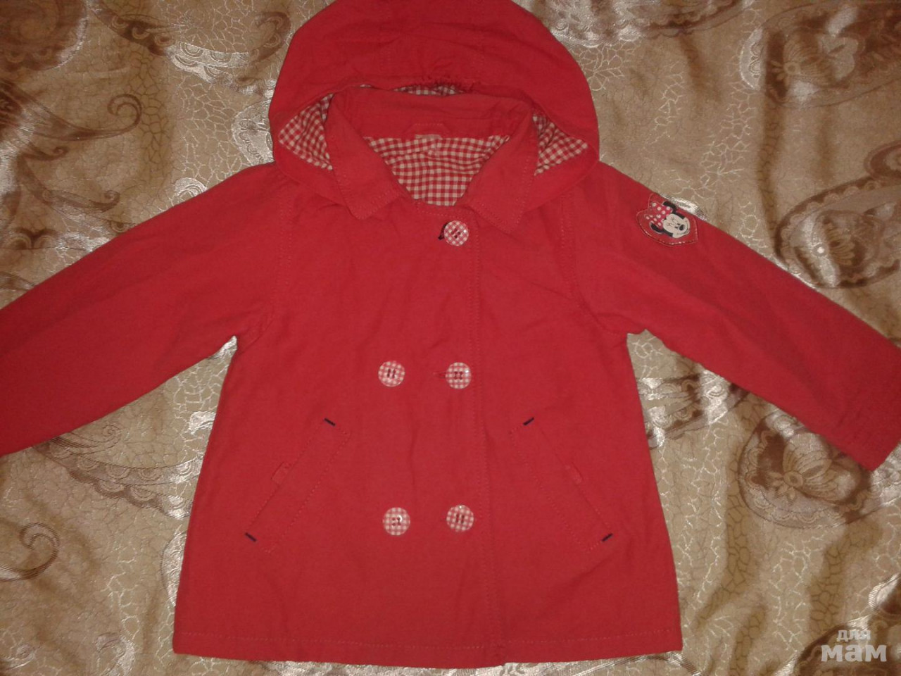 Плащ с хлопковой подкладкой. Размер примерно 2-2,5 года, этикетку срезали не помню какой размер точно, замеры: длина по спинке 38,5 см, длина рукава 31 см.