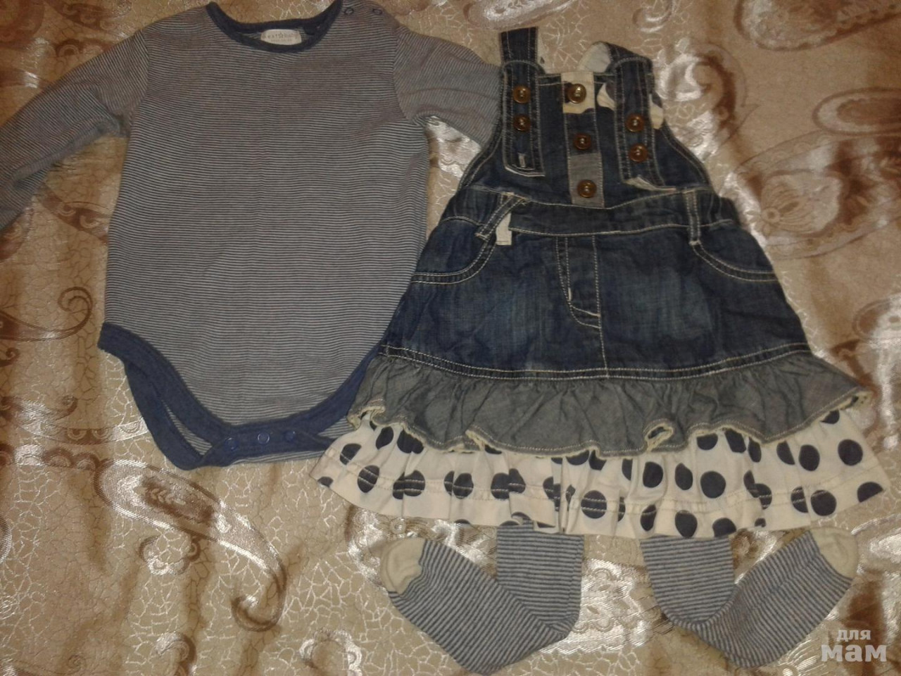 1) Размер, 80 см, 9-12 мес. Боди, сарафан, колготки. Цена 600 руб.