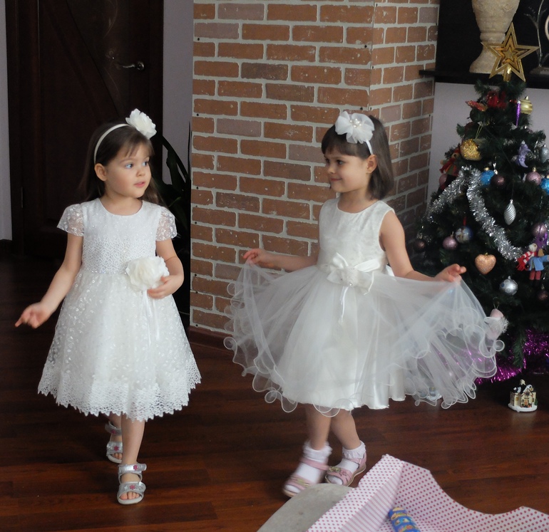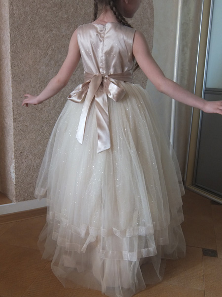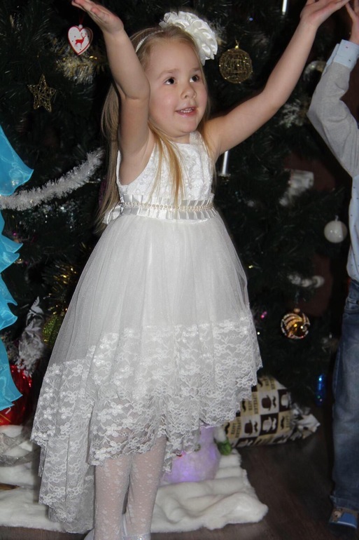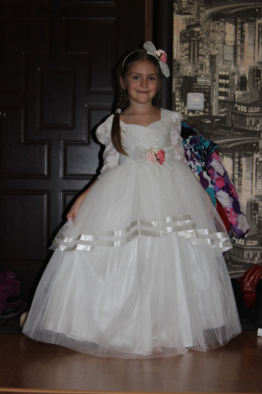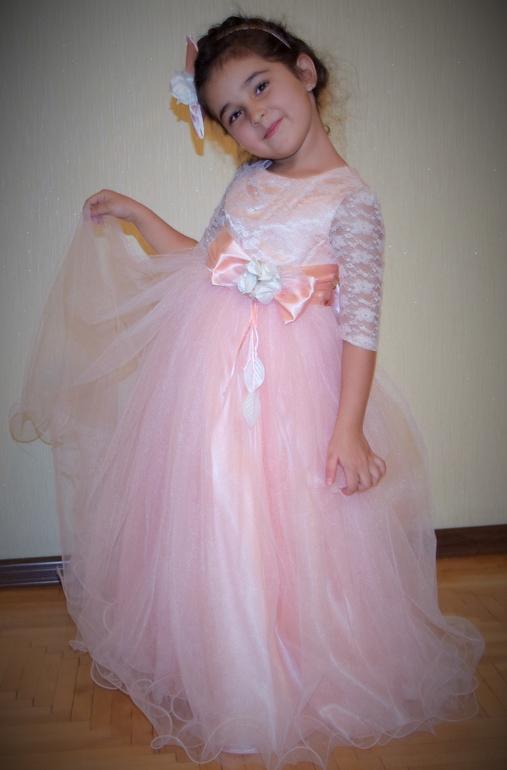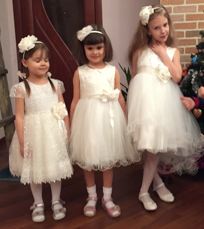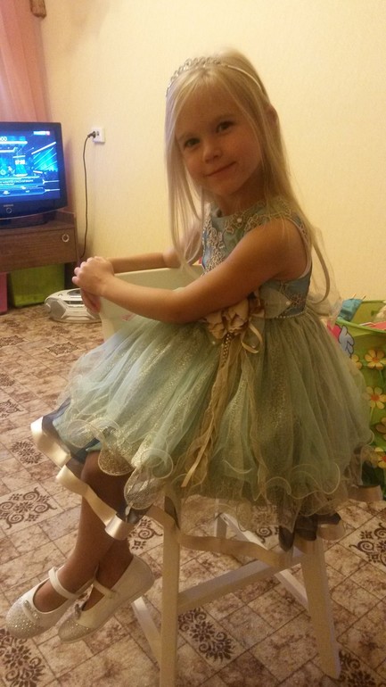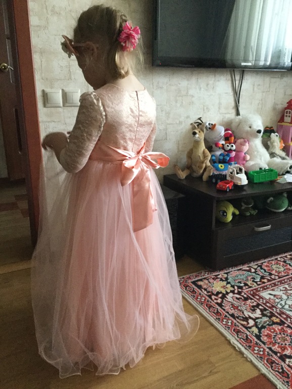 Люда, спасибо огромное за платье!!! Даже не представляю, сколько будет стоить в магазине платье такого уровня. Все супер! В реале платье оказалось более нежным, чем я ожидала, что нам, в принципе, и было нужно :-) Сфотографировались на скорую руку, поэтому без изысков :-) Но платье реально супер-класс!!! Уверена, что на елке она будет самая-самая) Размер 8, рост ориентировочно 125 см + небольшой каблучок. Платье в пол.