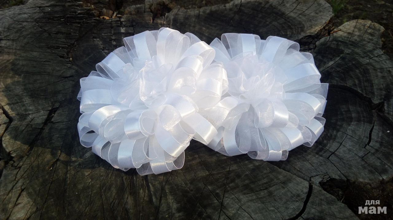 Могу смело сказать что это мое совместное детище со Светланой и Ольгой. Света просила большие и с атласными цветочками по центру, Оле нужны были диаметром меньше, атлас в центре сильно зрительно утяжелял, применила органзу. Итог - нереально легкие и воздушные.