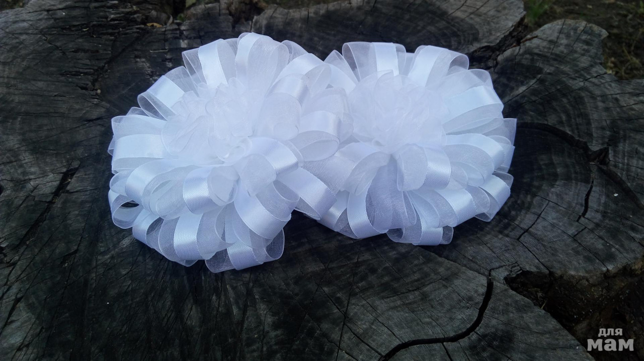 Могу смело сказать что это мое совместное детище со Светланой и Ольгой. Света просила большие и с атласными цветочками по центру, Оле нужны были диаметром меньше, атлас в центре сильно зрительно утяжелял, применила органзу. Итог - нереально легкие и воздушные.