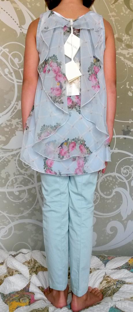 Monnalisa- превосходный комплект, каждый предмет которого можно носить раздельно. Только оригинал! Цена за комплект снижена, раздельно дороже. Размер на 8 лет, но лучше ориентироваться на рост до 128см. Брюки хлопок (не стрейтч), регулируемый на резинке пояс; блуза так же не тянется. Возможно подойдет даже с 6 лет.