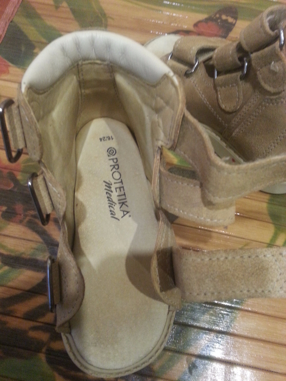 Ортопедические сандалики PROTETIKA с функцией стабилизации голеностопа. Высокий анатомически формованный берц. Супинатор. Каблук Томаса. Верх - нубук, внутри- кожа. Цвет бежевый.
