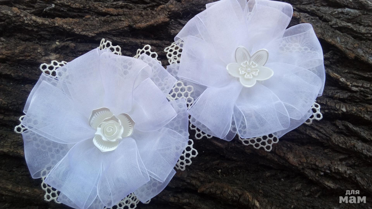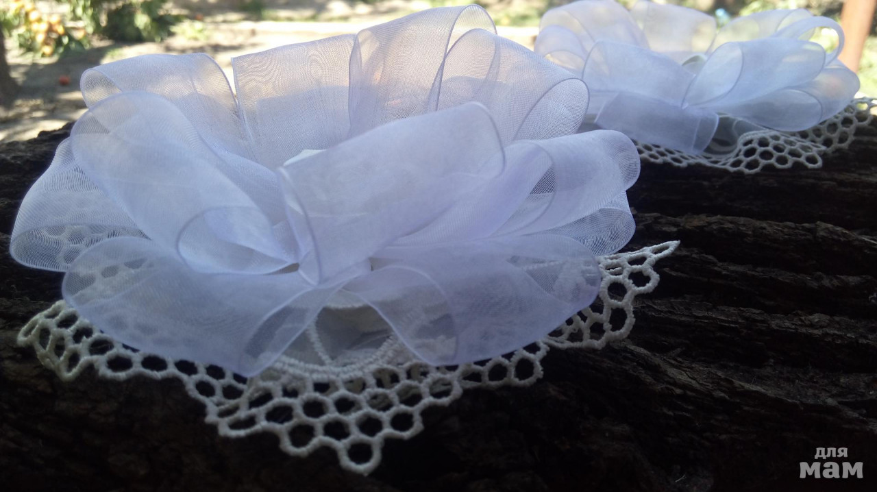 Диаметр 13 см по крайним точкам. Ооочень красивое молочное кружево. Потом слой белоснежного шифона (для нарядности)) и оригинальная изюминка - сборный цветочек молочного цвета.