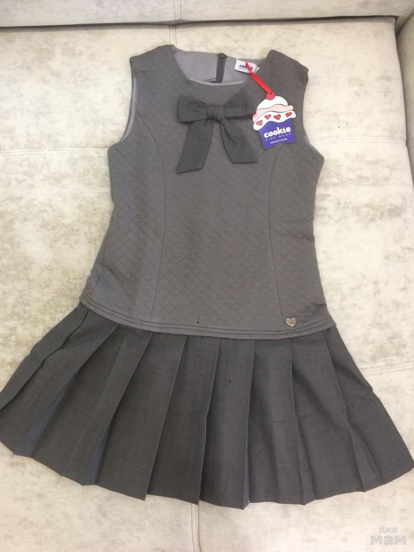 Необыкновенно комфортный сарафан, выполнен из футера, стёганого в ромбик, цвета - серый меланж. Украшен бантом на груди и маленькой металлической пуговичкой "Cookie" по низу лифа. Юбка сарафана в складку из полушерстяной высококачественной ткани тёмно-серого цвета. Сарафан очень приятный на ощупь. Верх - хлопок 80%, полиэстер 20%; юбка - шерсть 45%, полиэфир 55%.
