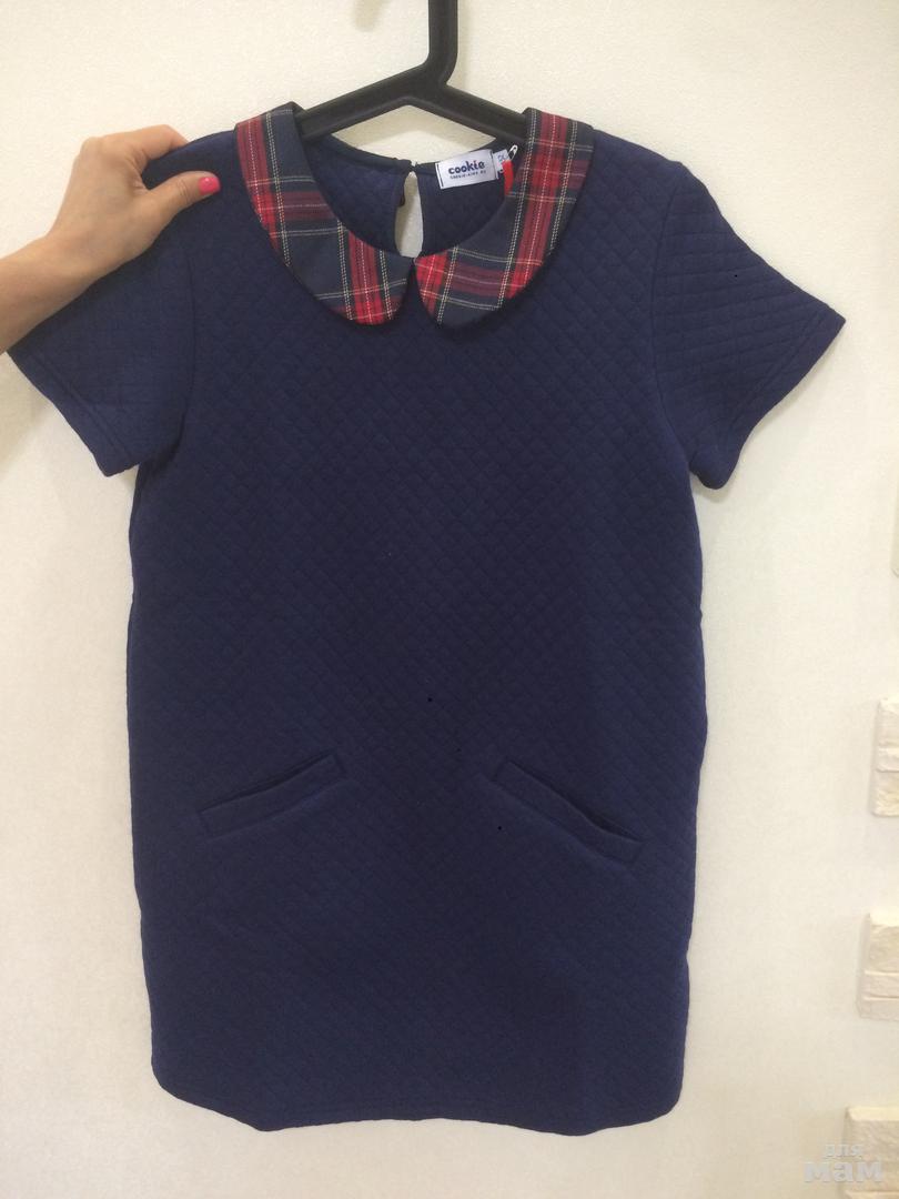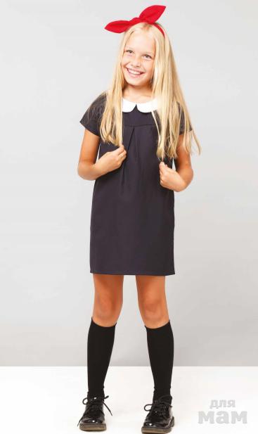Платье свободного кроя, изготовлено из полушерсти темно-синего и серого цветов. Модель с белым отложным воротничком и карманами в боковых швах. Дополнительный комфорт обеспечивает подкладка из 100% хлопка. Замечательно смотрится не только само по себе, но и с водолазкой или футболкой с длинным рукавом. Не стесняет движений, поэтому отлично подойдет для школы или садика. Шерсть 45%, полиэфир 55%; подкладочная ткань – хлопок 100%.