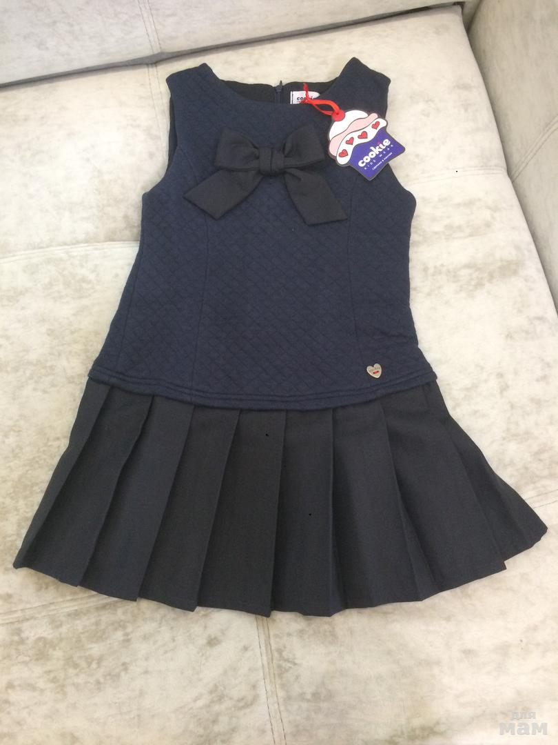 Необыкновенно комфортный сарафан, выполнен из футера, стёганого в ромбик, темно-серого цвета. Украшен бантом на груди и маленькой металлической пуговичкой "Cookie" по низу лифа. Юбка сарафана в складку из полушерстяной высококачественной ткани тёмно-синего цвета. Сарафан очень приятный на ощупь. Верх - хлопок 80%, полиэстер 20%; юбка - шерсть 45%, полиэфир 55%.