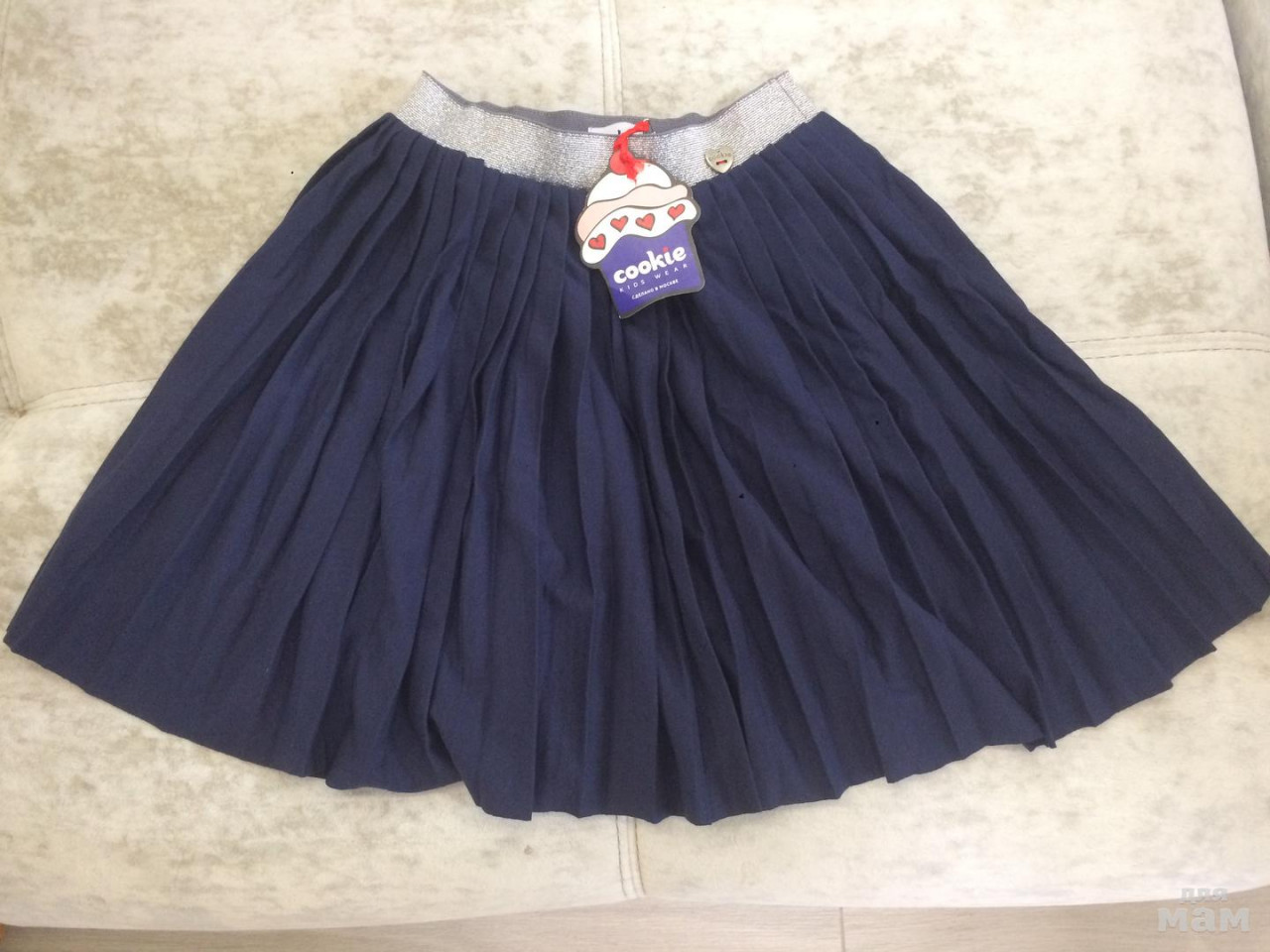 Плиссированная юбка синего цвета на эластичной серебристой резинке с люрексом. Юбка мягкая и воздушная, украшена металллической поговичкой "Cookie" на талии. Материал юбки тонкий и лёгкий, очень приятный на ощупь. Хлопок 70%, полиэстер 30%.