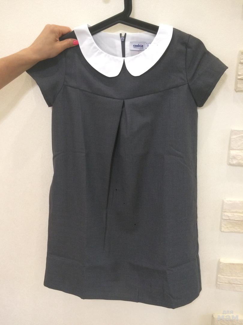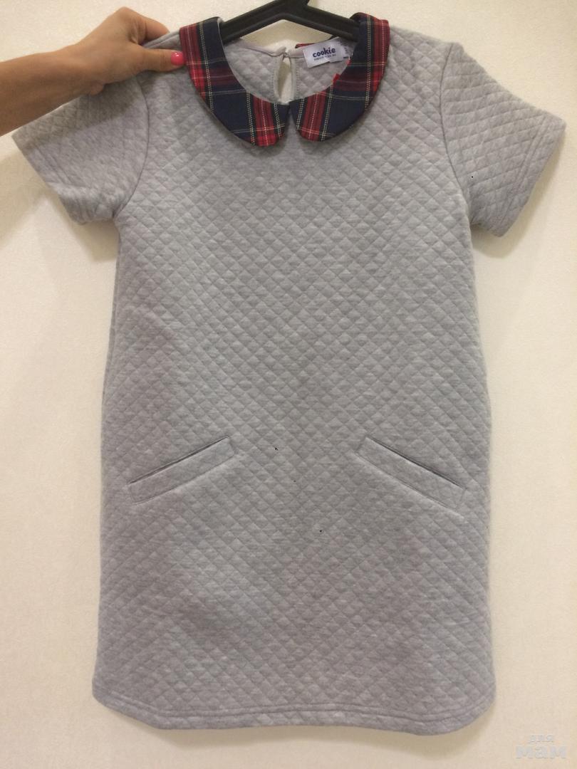 Платье свободного кроя, изготовлено из полушерсти темно-синего и серого цветов. Модель с белым отложным воротничком и карманами в боковых швах. Дополнительный комфорт обеспечивает подкладка из 100% хлопка. Замечательно смотрится не только само по себе, но и с водолазкой или футболкой с длинным рукавом. Не стесняет движений, поэтому отлично подойдет для школы или садика. Шерсть 45%, полиэфир 55%; подкладочная ткань – хлопок 100%.
