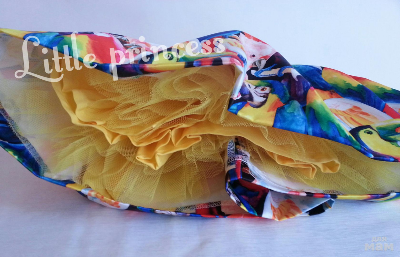 Юбка с пышным многослойным подъюбником ярко-желтого цвета, хлопковый подклад. В пояс юбки с двух сторон вставлена резинка с пуговкой, которая позволяет утягивать поясок до нужного объема