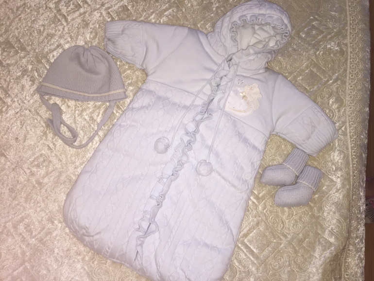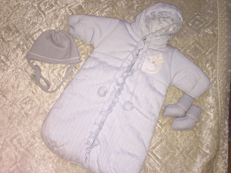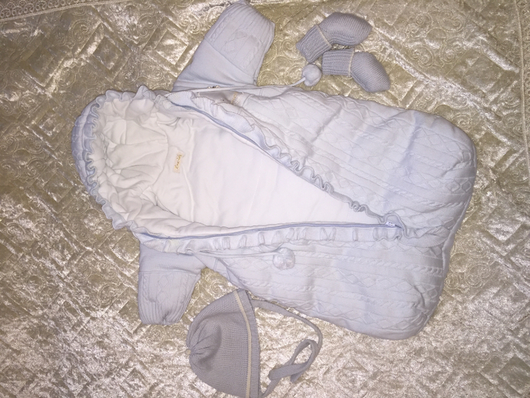 Шикарный конверт для новорожденного мальчика Lina's baby, размер указан 68, использовать можно до указанного возраста. Отлично подойдет на выписку. Шапочка и пинетки Le Guignol for Daniel.