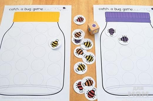 Используем игральный кубик. Каждый игрок кидает кубик и кладет в свою банку столько жуков, сколько выпало на кубике. Побеждает тот, кто быстрее наполнит свою банку.