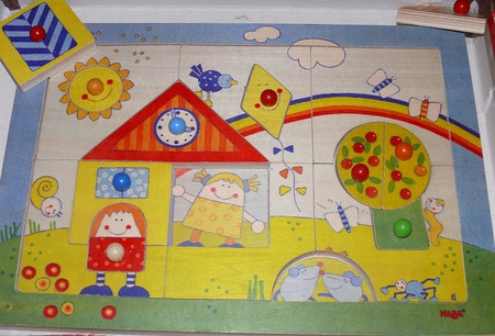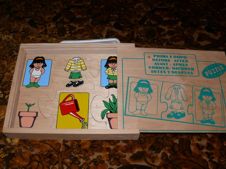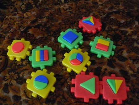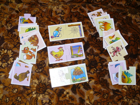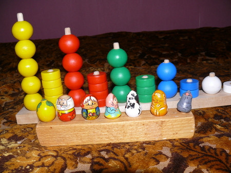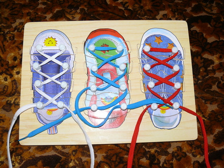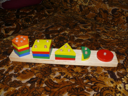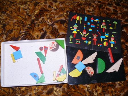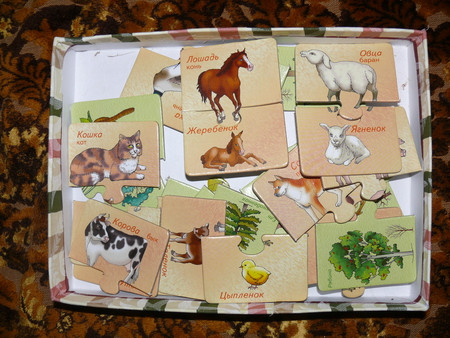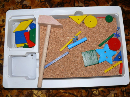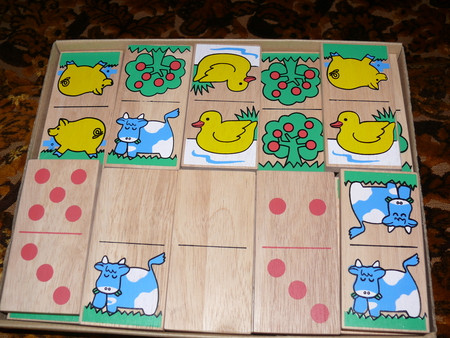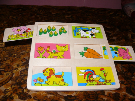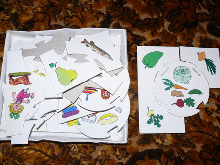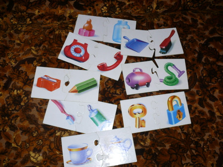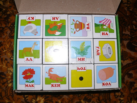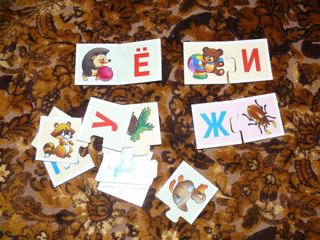всякие там вкладыши - сейчас уже играем чисто по названиям - фигур, машин и рыб - говорю какую именно вложить (дельфин) и ту вкладываем -так как уже с года не составляло огромного труда подобрать по форме - что куда