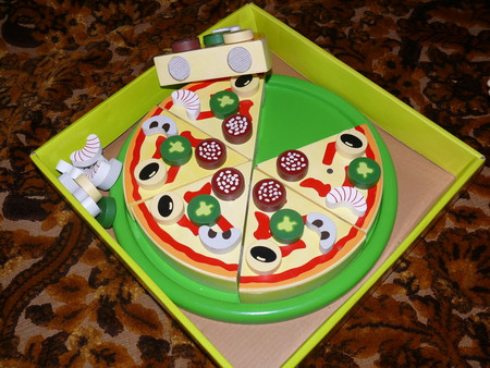 наша новая игрушка - пицца - на магнитах колбаска и все остальное - а куски лепятся на липучка х - изучение дробей - складывание круга - сортировка - и много чего из нее можно исчерпать