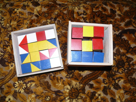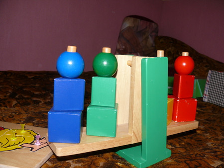 нужно собрать по очередности - кубик, треугольник, шарик - еще и по цветам - так же как весы (можно познакомиь с понятием весов)