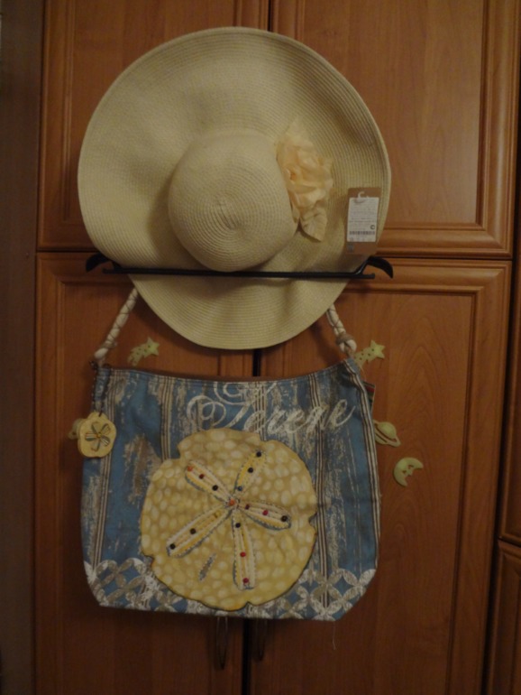 Шикарная вместительная текстильная сумка, с очень стильным оформлением и шляпу с огромными регулирующимися полями и цветком.
