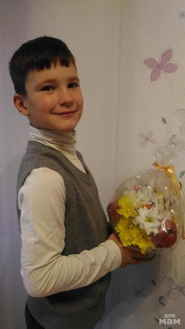 Женя быстро переоделся, схватил у меня букет и убежал в класс)))