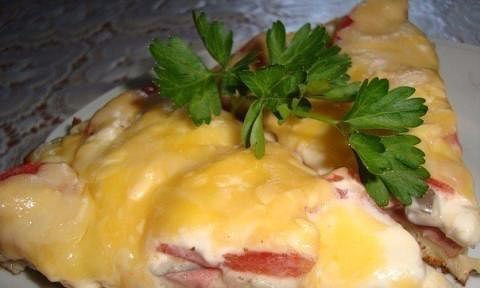 Смешать яйцо, муку, сметану, майонез. Тесто получается жидкое, как сметана. Тесто вылить на сковороду и уже сверху положить любую начинку. У меня сосиски, потом чуть копченой колбасы, слегка прожаренные грибы.Сверху помидоры. Сделать сеточку из майонеза и засыпать толстым слоем сыра.