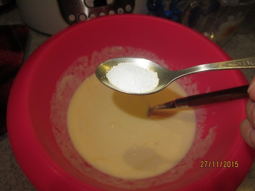 1. В кефир добавляем одно яйцо, сахар, соль и растительное масло, хорошенько перемешиваем.